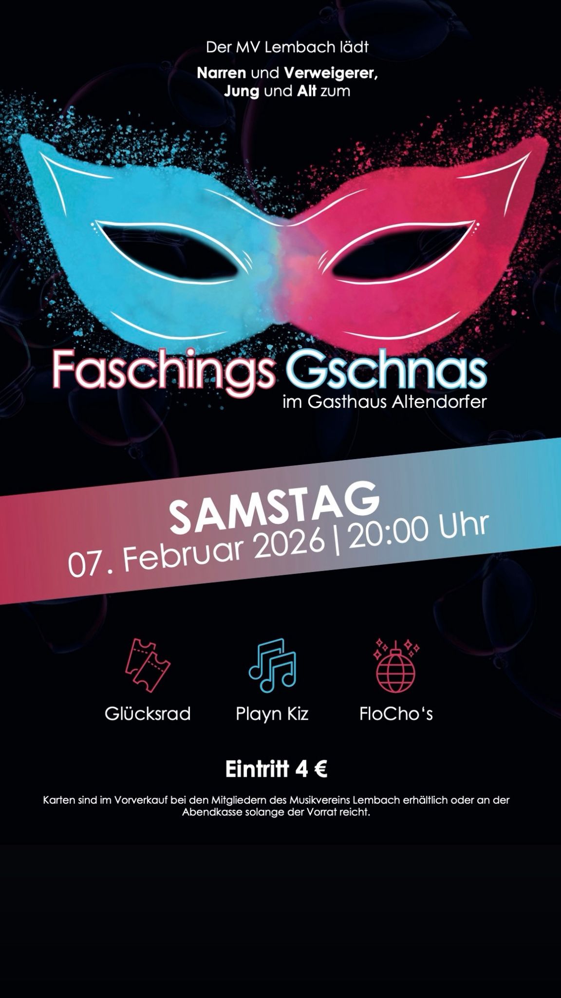 Nach Weihnachten ist vor dem Fasching – besser gesagt vor dem Faschings-Gschnas des Musikvereins Lembach. Dieser Höhepunkt des Lembacher Faschings findet heuer am Samstag, 7. Februar 2026, ab 20:00 Uhr im Gasthaus Altendorfer statt. Für Musik sorgen diesmal die Playn Kiz (mit Luki Rauöcker), im FloCho’s gibts Diskomusik und beim Glücksrad super Preise. Wir laden Euch herzlich Ein – wir freuen uns auf Euch!